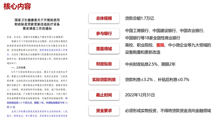 而從市場看來,此次引入財政貼息貸款支持醫(yī)療設(shè)備更新改造,也是國內(nèi)醫(yī)療新基建的關(guān)鍵一環(huán)。